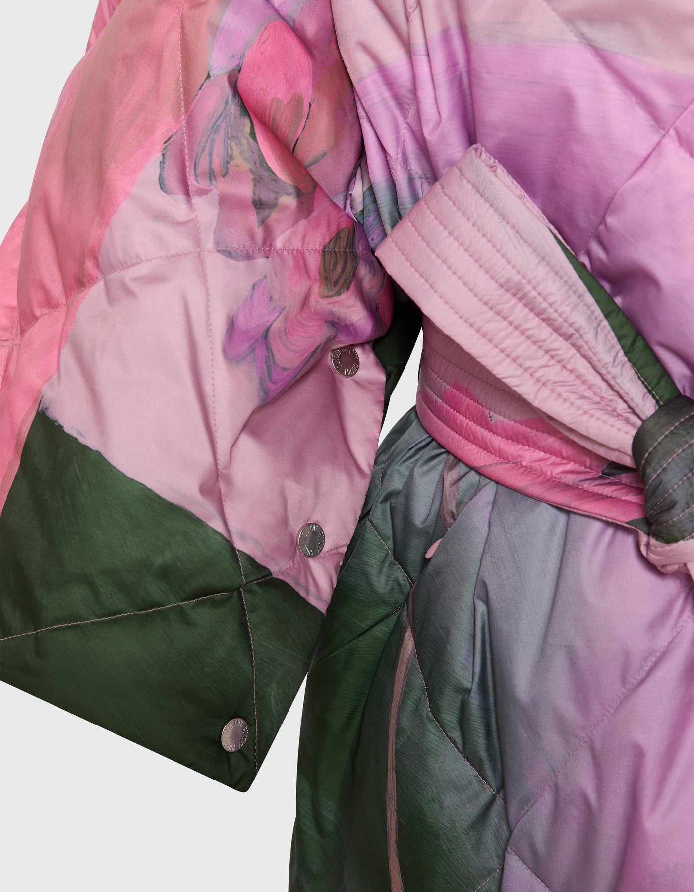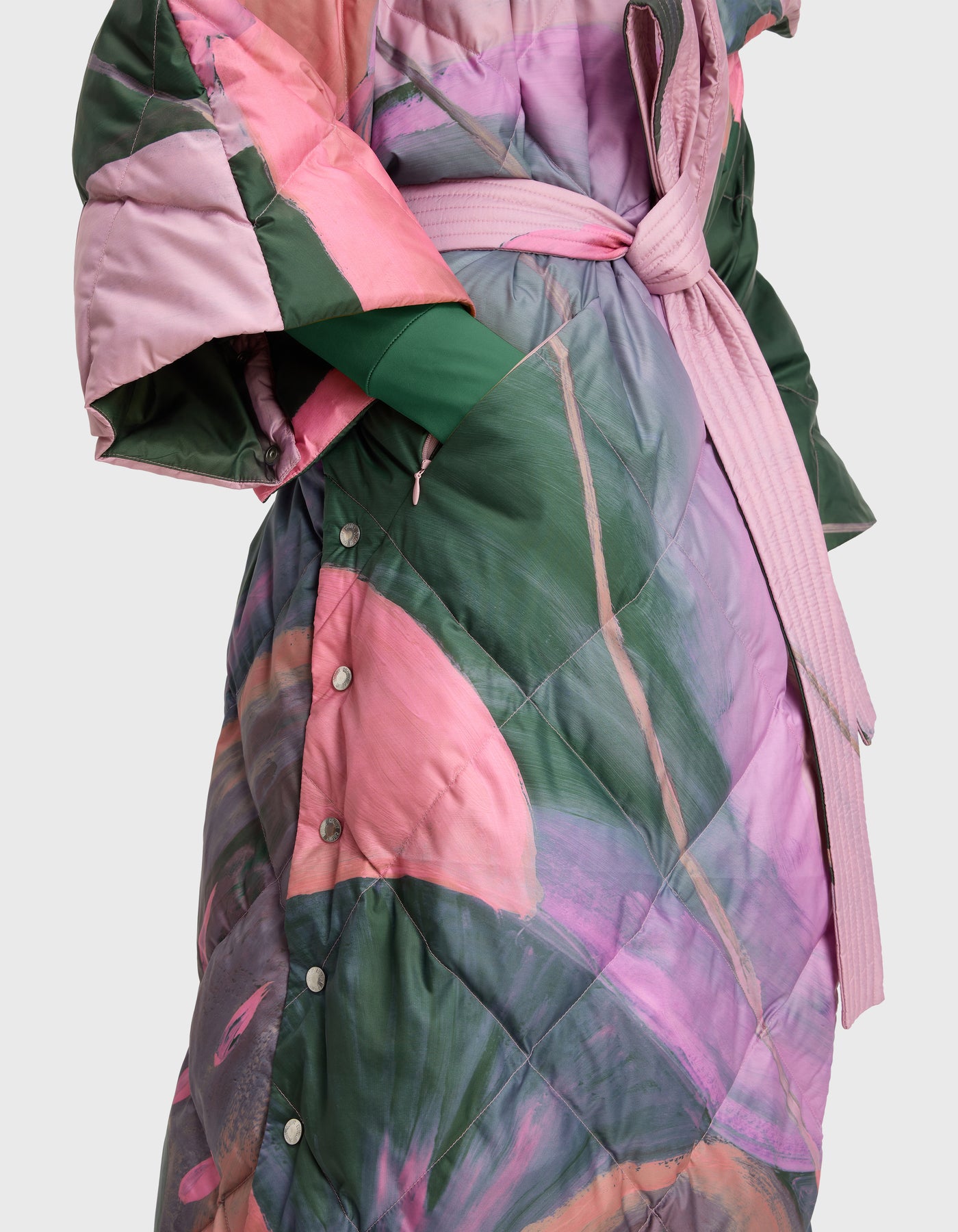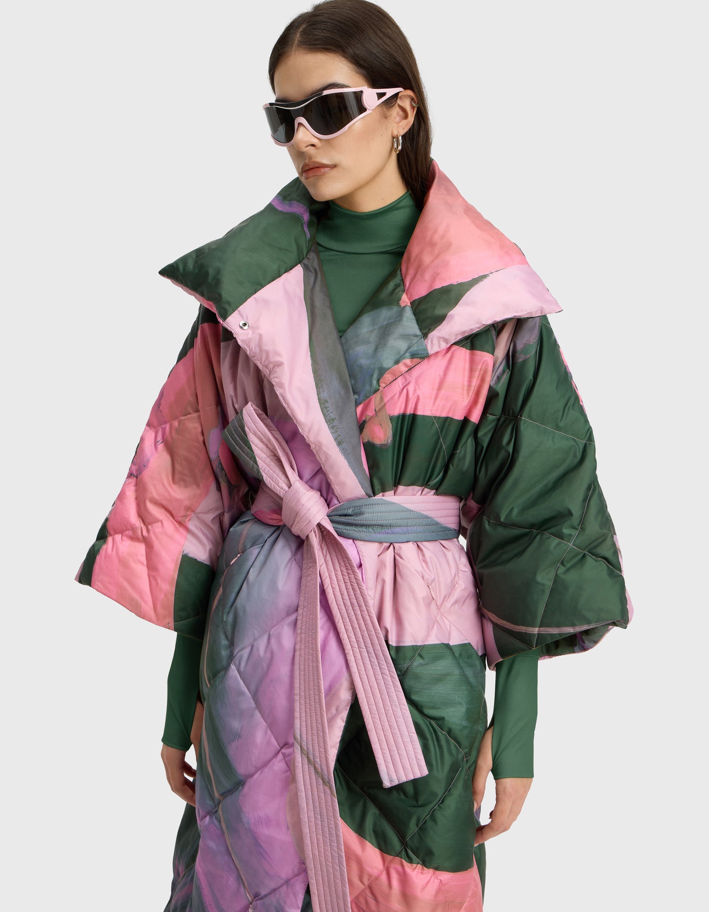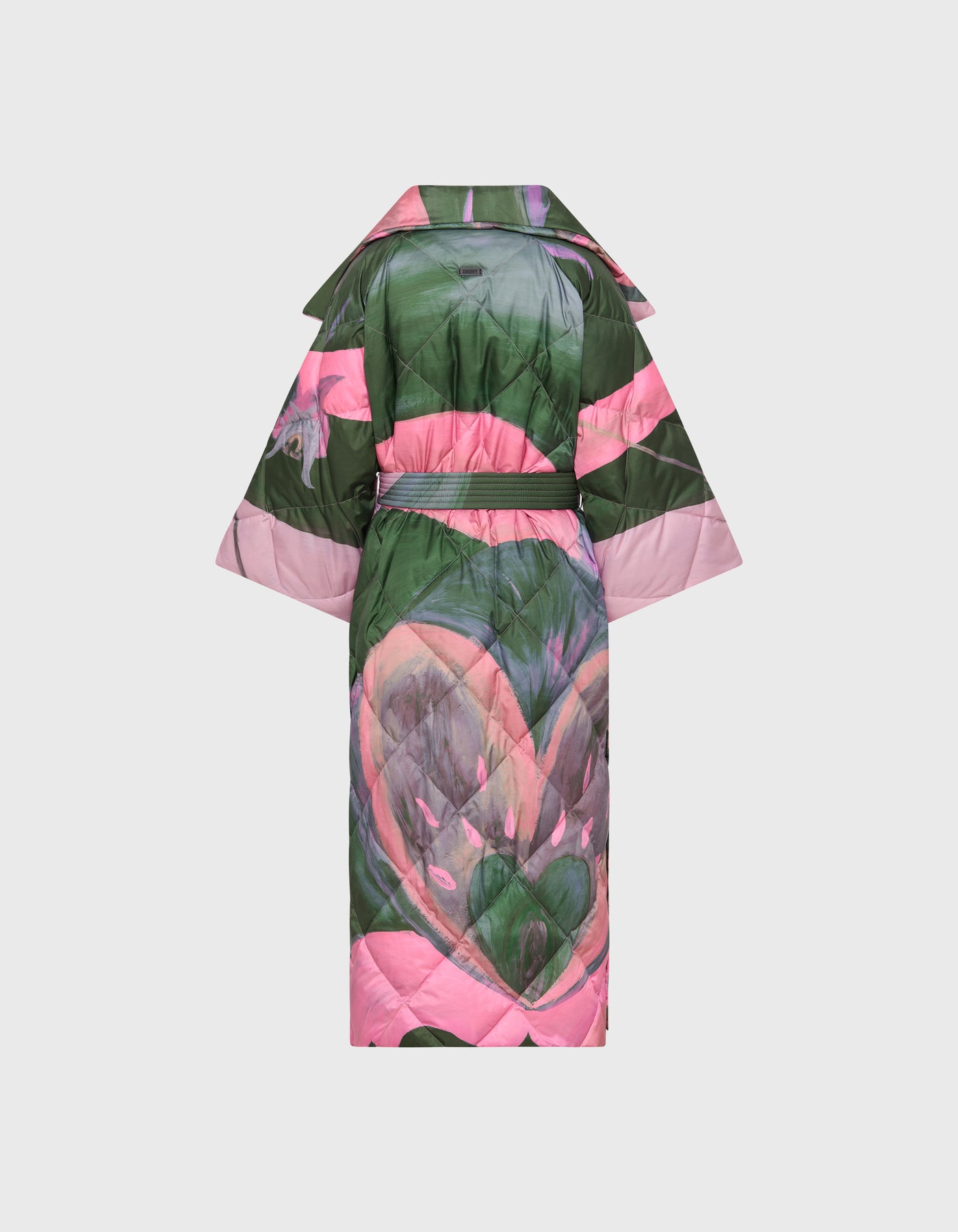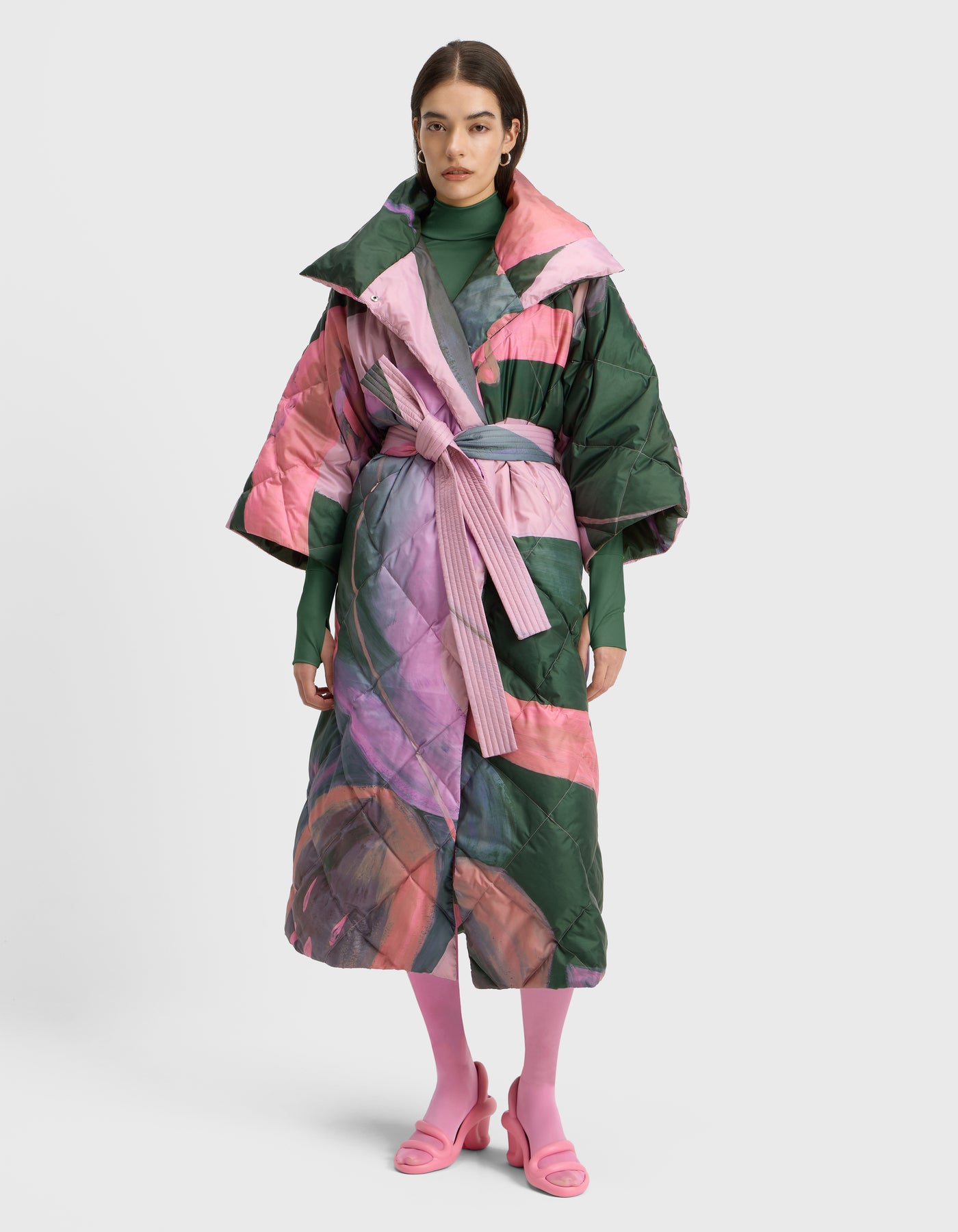 TYRA introduces an artistic dimension with a hand-painted print, enhancing its sculptural elegance and kimono-inspired design. The three-quarter sleeves, diamond quilting, and snap-buttoned sides allow for versatile styling, while a long belt cinches the waist to create a defined silhouette. The overlapping front closure completes the piece’s refined, modular appeal — now with a one-of-a-kind printed finish.