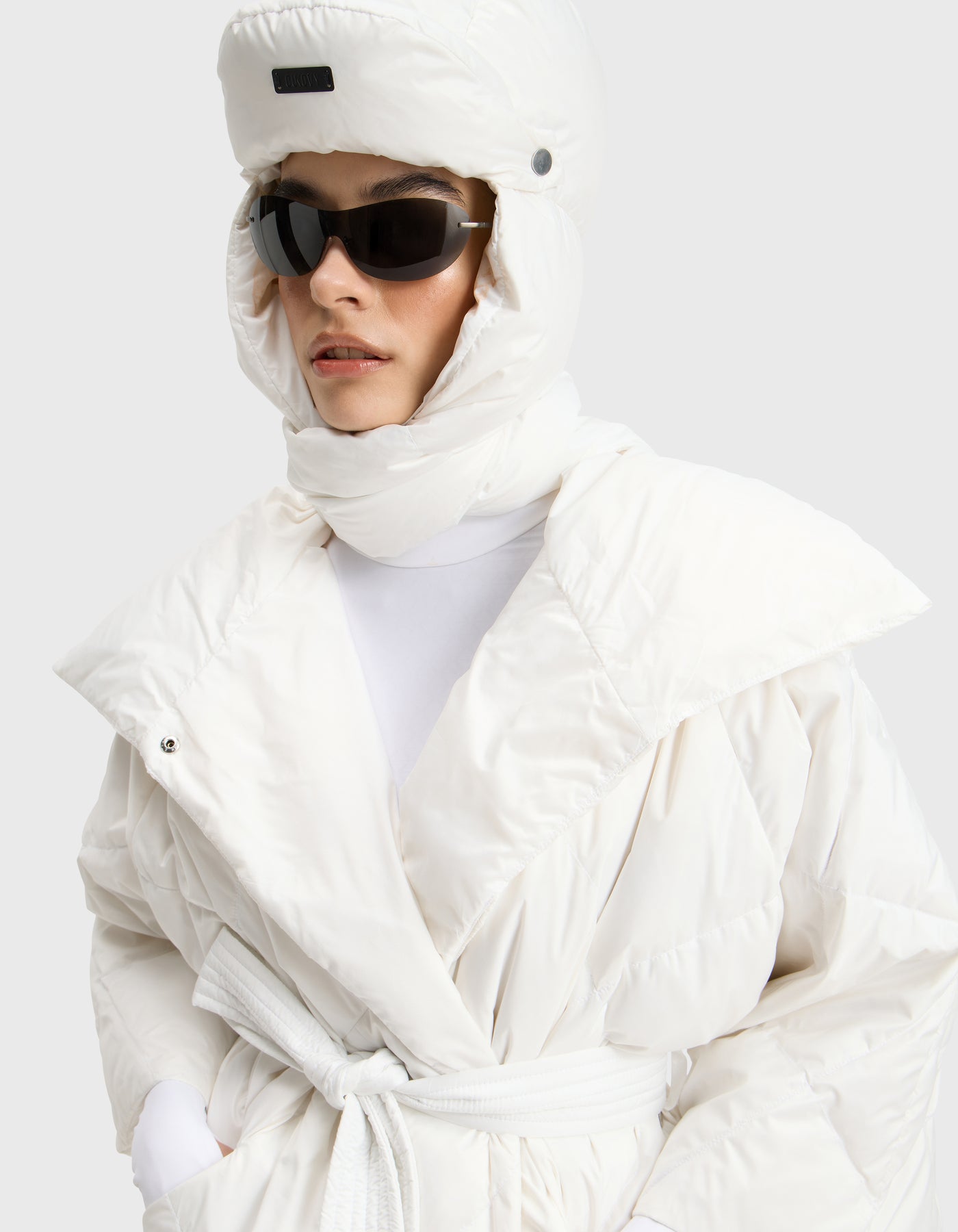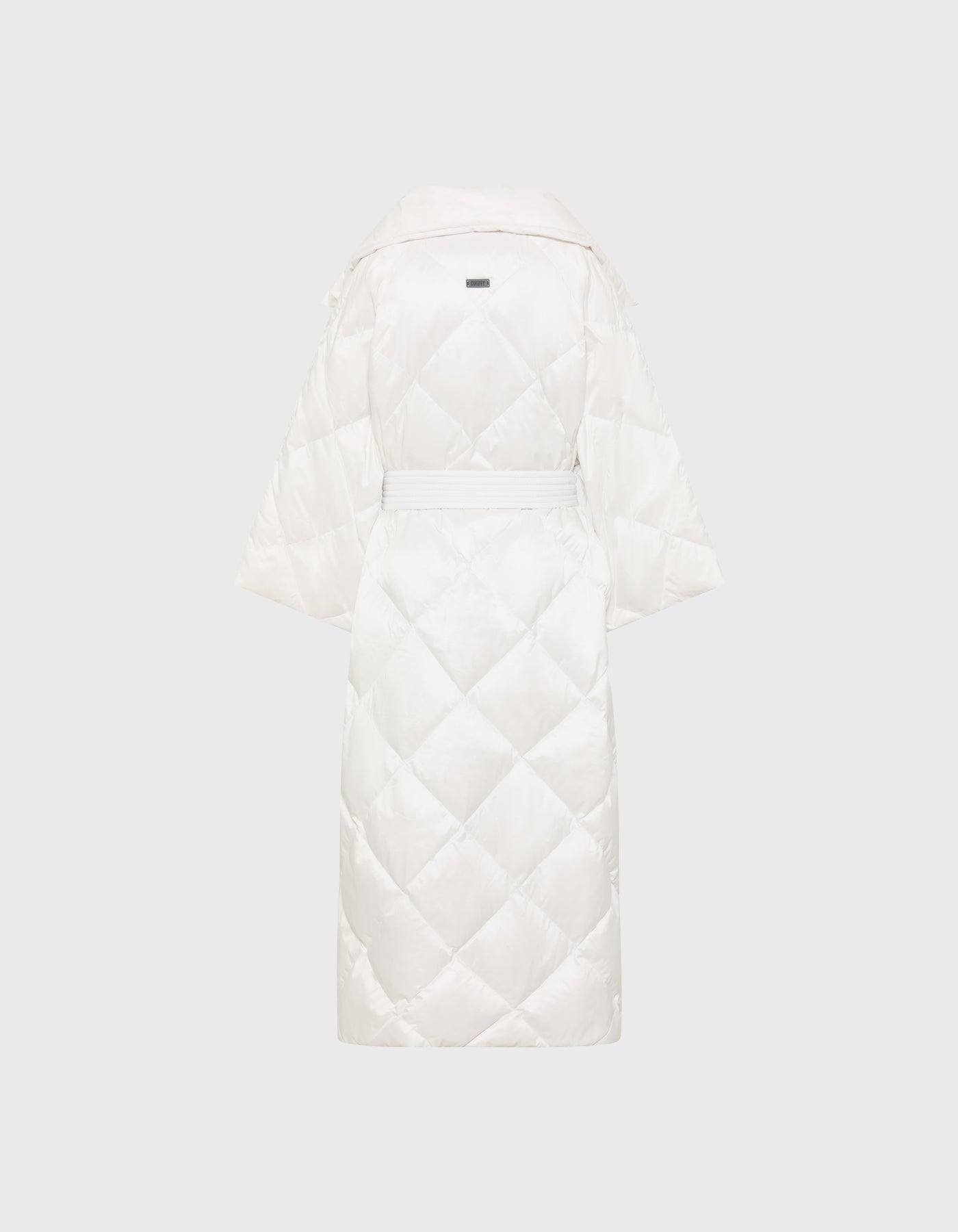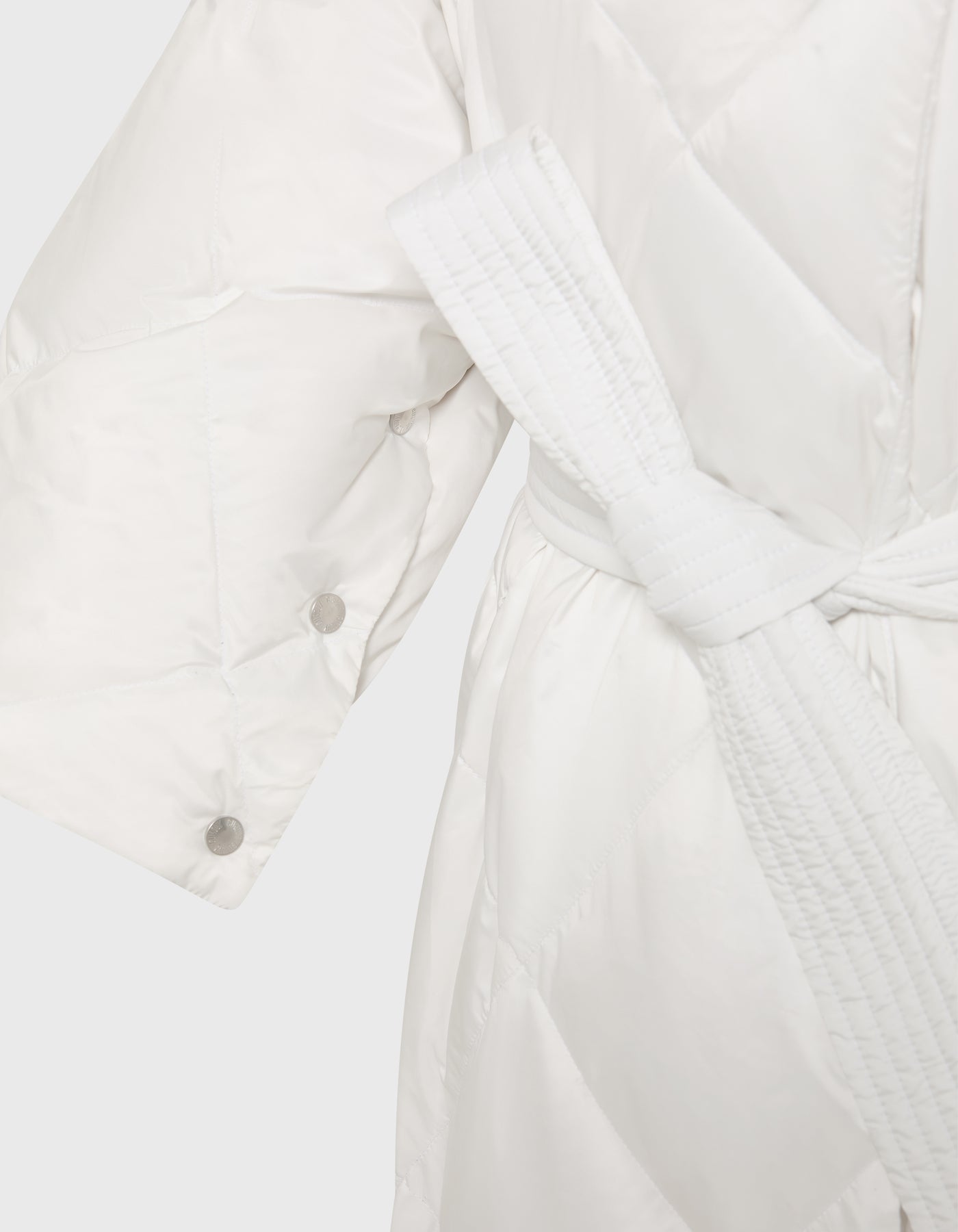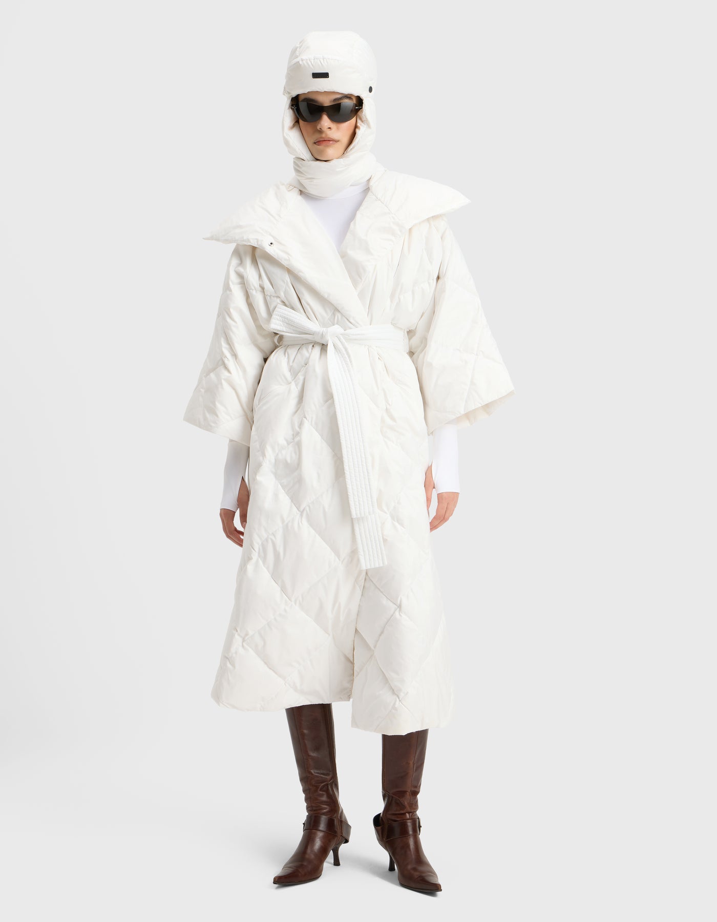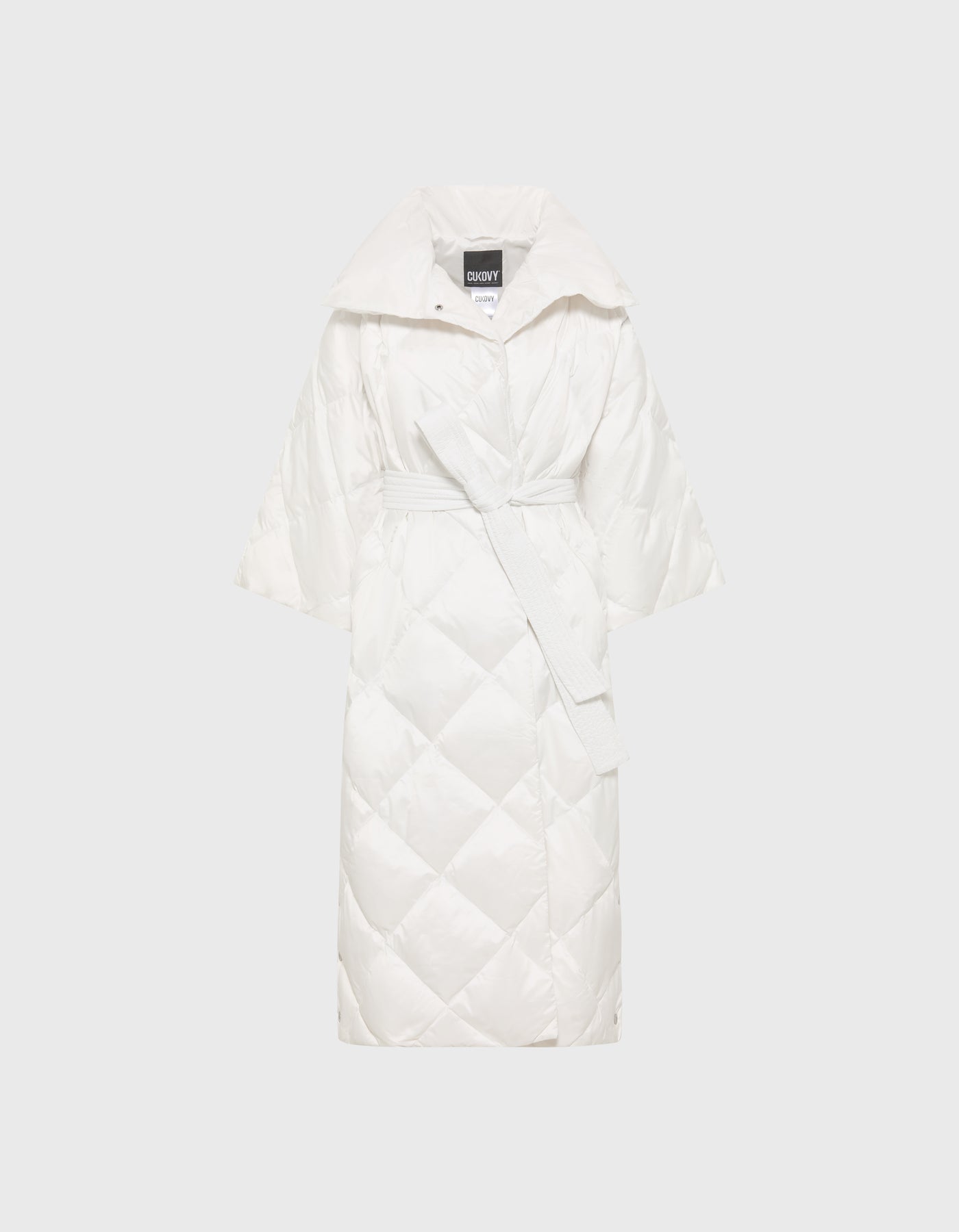TYRA brings a sculptural elegance to outerwear, merging the relaxed fluidity of a kimono with the structure of diamond quilting. Its three-quarter sleeves and snap-buttoned sides allow for versatile styling, while a long belt cinches the waist to create a defined silhouette. The overlapping front closure enhances its refined, modular appeal — a piece designed to move seamlessly between function and form.
